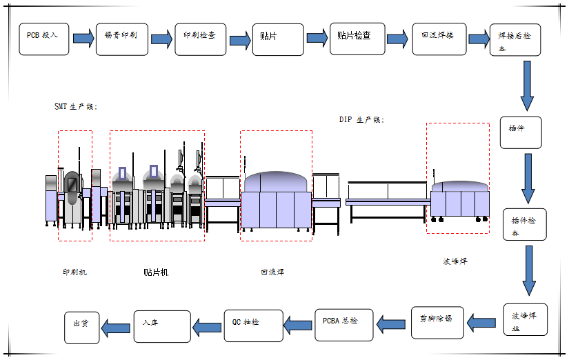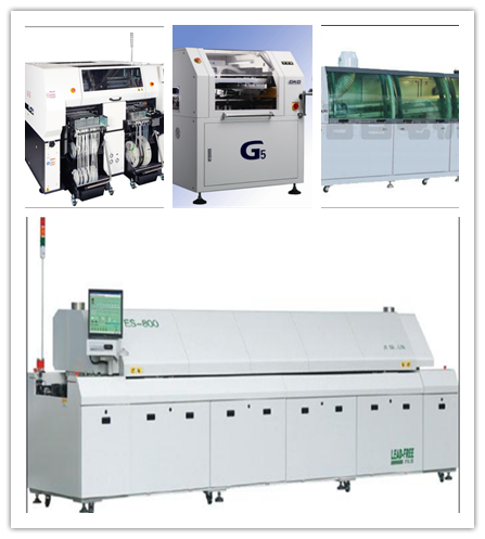 貼片車間生產(chǎn)線目前有1條SMT(表面封裝焊接技術(shù))與DIP(通孔封裝焊接技術(shù))組成。其中SMT設(shè)備有全自動(dòng)上板機(jī)1臺(tái),全自動(dòng)傳送接駁設(shè)備3臺(tái),GKG全自動(dòng)印刷機(jī)1臺(tái),Panasonic-AM100高速貼片機(jī)2臺(tái),JTE全自動(dòng)熱風(fēng)回流焊爐1臺(tái),錫膏攪拌機(jī)1臺(tái)及全自動(dòng)烘箱1臺(tái)組成;DIP設(shè)備有全自動(dòng)插件線2條,日東全自動(dòng)波峰焊接爐1臺(tái),全自動(dòng)出板接駁設(shè)備1臺(tái),電容成型機(jī)1臺(tái)及電阻成型機(jī)1臺(tái);周邊輔助設(shè)備空壓機(jī)1臺(tái),冷干機(jī)1臺(tái)及風(fēng)機(jī)1臺(tái)。